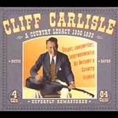 CO-2717 V.A.『Clawhammer Banjo, Vol.2』CD\2,573-(本体\2,450-) Jake Gillie/Sourwood Mountain/Sandy River/Cripple Creek/Fortune/Sally Ann/Shady Grove 他全19曲 先月紹介した1965年発表の『Clawhammer Banjo, Vol.1』(CO-2716 CD\2,573-)につづく第2弾。1967年にカウンティー・レコード717番のLPアル バム『More Clawhammer Banjo Songs & Tunes』として発表された名盤のCD復刻である。先の第1弾 同様、クロウハンマー・バンジョー奏法の貴重な、ブルーグラス・バンジョーならフラット&スクラッグス の『Foggy Mountain Banjo』(CCS-100 CD\2,573-)に匹敵する、という代物。本作が収録された1960年 代、すでにブルーグラス・スタイルが猛威をふるっていたものの、1945年暮れのアール・スクラッグス登 場以前からの伝統的なバンジョー奏法を受け継いでい たオールドタイマーたちも元気で活躍していた。そんな彼ら、オスカー・ライト、フレッド・コッカラ ム、マトキー・スローター、トミー・ジャレル、グレン・スミスら、アパラチア山脈の南、ブルーリッ ジの山懐のコミュニティーにそれぞれ伝わってきた「本物」のアパラチアン・クロウハンマー・バン ジョー集。時おりボーカルやフィドルとのデュオを含むが、ほとんどはバンジョーのソロ・インスト集。 70年代以降の若手オールドタイマーらの洗練された音楽性には及ばないが、長年アパラチア山中に閉じ込め られてきたプリミティブな匂いがたまらない。 JSP-7732 CLIFF CARLISLE『A Country Legacy 1930-1939』CD4枚組\5,775-(本体\5,500-) ジミー・ロジャーズと同様の「ブルー・ヨーデラー」として知られるクリフ・カーライルのキャリ